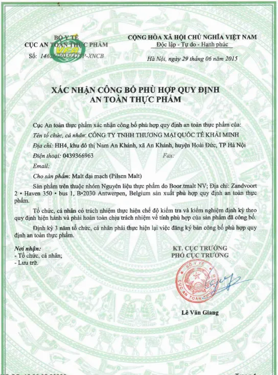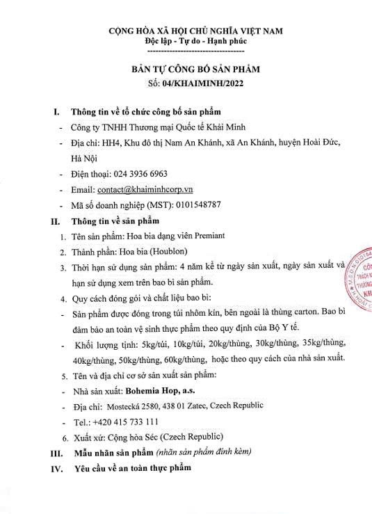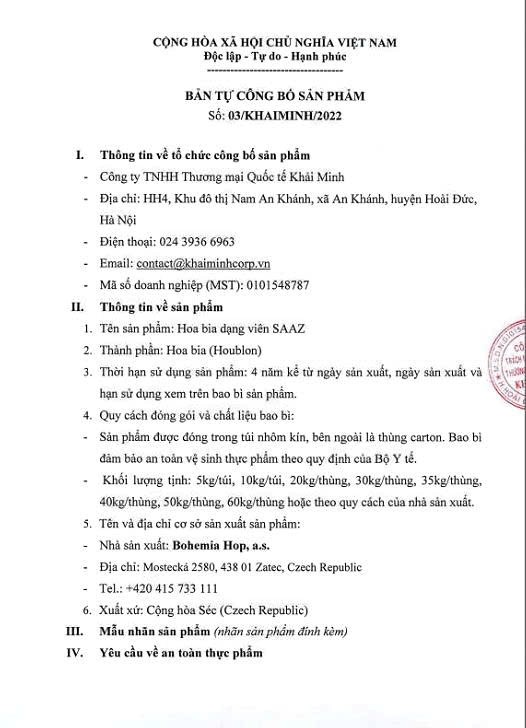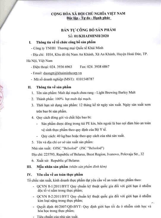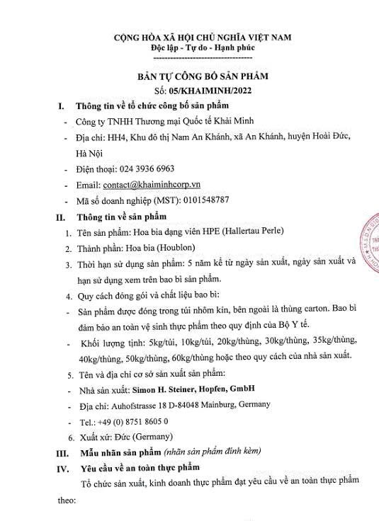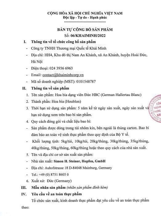 Liên hệ hợp tácCông ty TNHH Thương mại Quốc tế Khải Minh là đơn vị chuyên cung cấp nguyên liệu trong các ngành đồ uống, thực phẩm. Các sản phẩm chính của Công ty bao gồm malt, gạo, hoa bia và cao hoa.